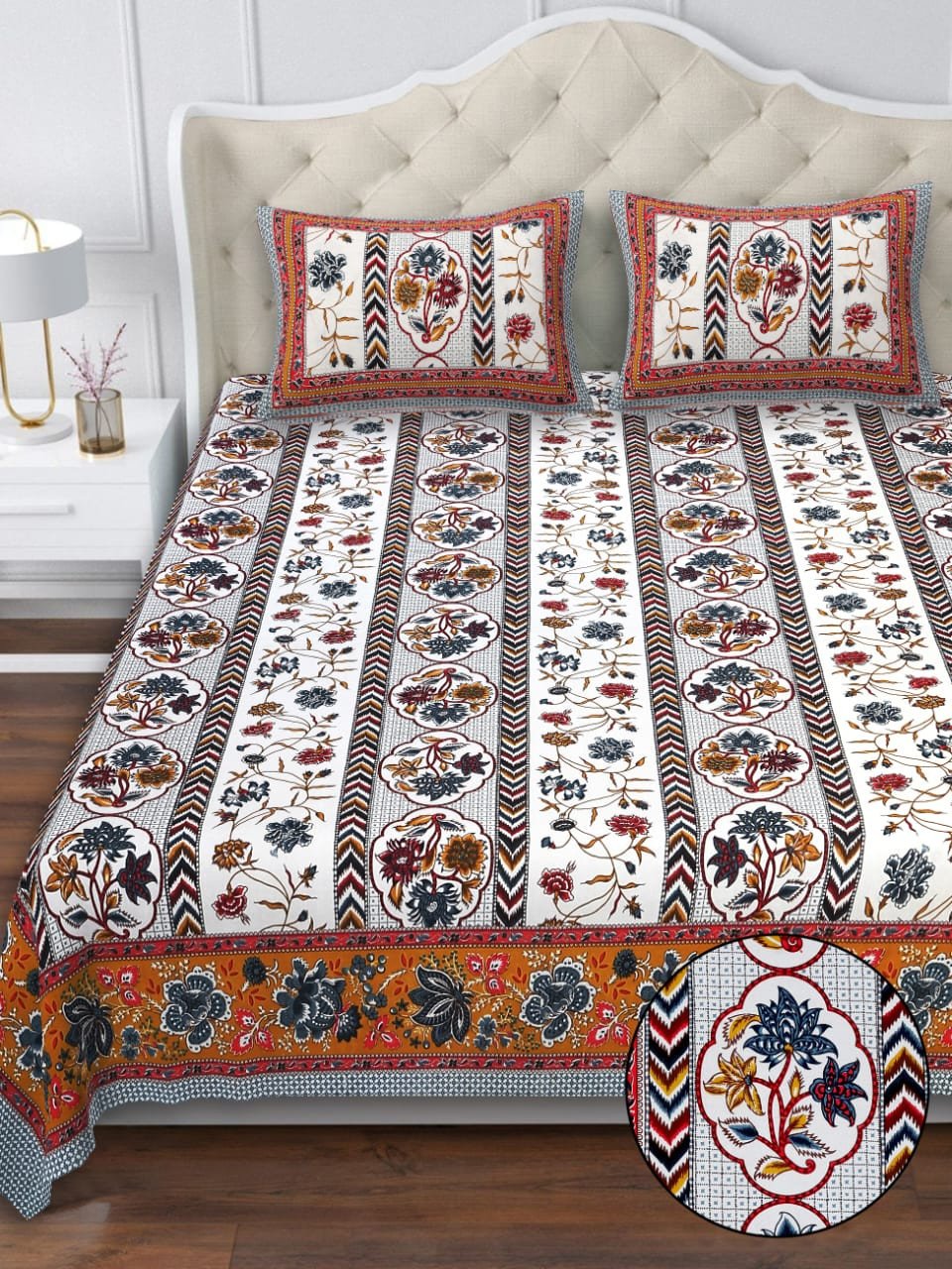 Upgrade your bedroom with the charm of Rajasthan! This Jaipuri Sanganeri Print Bedsheet Set is crafted from 100% premium cotton, offering both softness and breathability for a luxurious sleep experience. The elegant handblock Sanganeri print adds ethnic grace and vibrant aesthetics to your space, making it the perfect fusion of tradition and modern living.